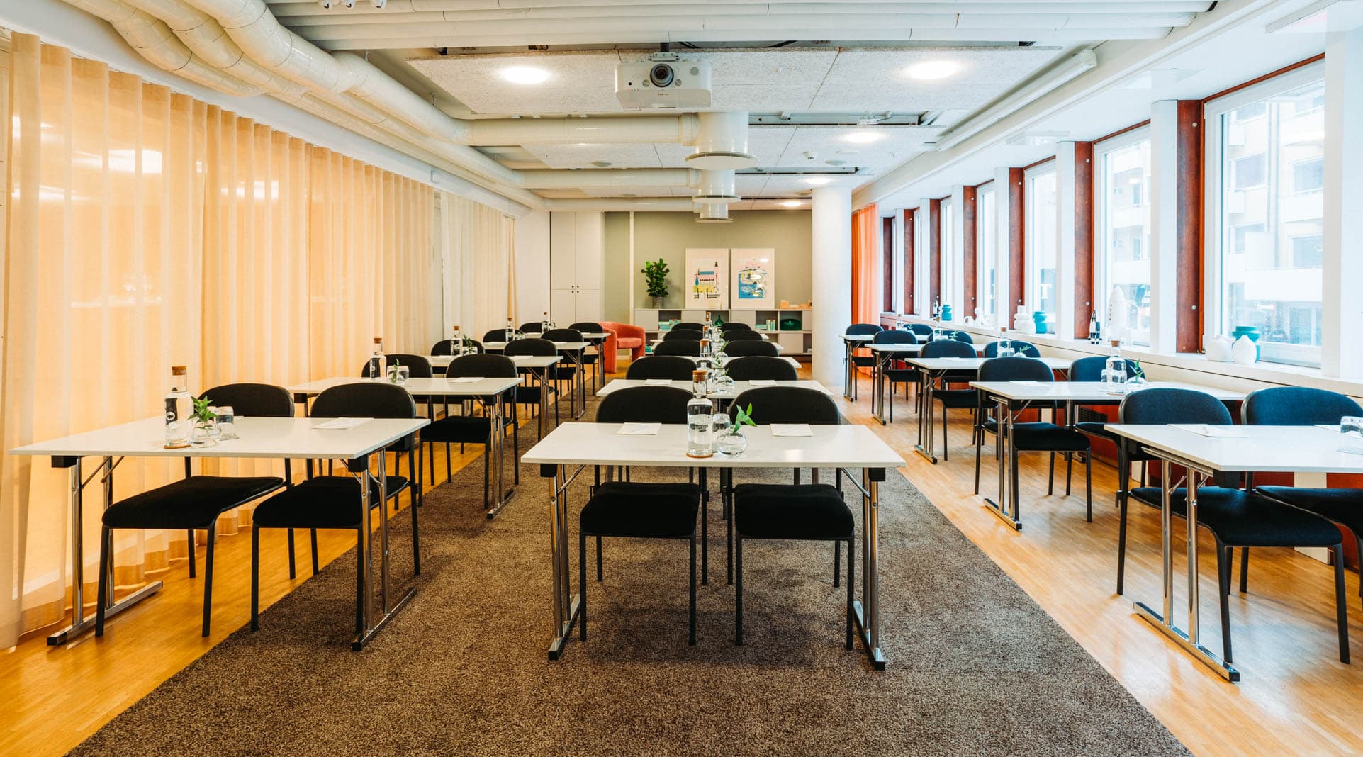 Vårt största konferensrum Loke, med imponerande sex meter i takhöjd, rymmer upp till 350 personer. Ett iögonfallande glastak sträcker sig över lokalen och ger ett fantastiskt ljusinsläpp. Loke fungerar utmärkt för att arrangera större evenemang som mässor, konferenser, utställningar, seminarier eller skiljedomar. Glasväggarna i den bakre delen av lokalen kan skjutas undan för att öppna upp mot den tillhörande loungen om så önskas. 7A Odenplan vill skapa en hemtrevlig känsla i en professionell miljö. Vi har även gedigen erfarenhet av att skapa lyckade mötesupplevelser online och erbjuder paketlösningar och skräddarsydda upplägg för alla typer av digitala arrangemang.